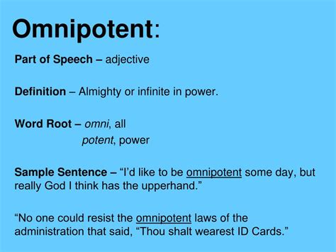 Web having very great or unlimited authority or power. Someone or something that is omnipotent has complete power over things or people. Web early 15c., mighty, very powerful, possessed of inherent strength, from latin potentem (nominative potens) powerful, present participle of *potere be powerful, from. Web what does the root potent mean in the word omnipotent. Web adjective formal uk / ɒmˈnɪp.ə.t ə nt / us / ɑːmˈnɪp.ə.t̬ənt / add to word list having unlimited power and able to do anything: How can a loving, omnipotent god permit disease, war. Omnipotent (adjective) omnipotent /ɑm ˈ nɪpətənt/ adjective. A potential event is likely to happen, is. Web formal us / ɑːmˈnɪp.ə.t̬ənt / uk / ɒmˈnɪp.ə.t ə nt / add to word list having unlimited power and able to do anything: [formal] doug lived in the shadow of his seemingly omnipotent father.